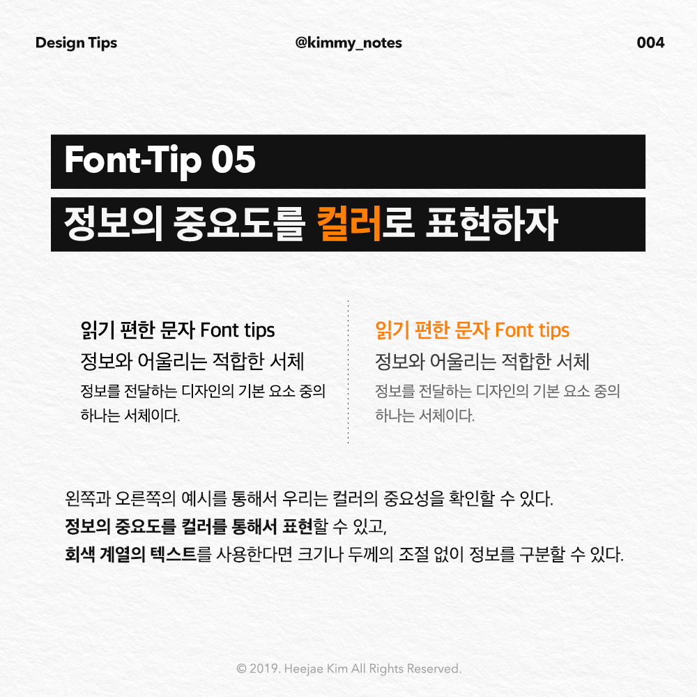 정보의 중요도를 컬러를 통해서 표현할 수 있고, 회색 계열의 텍스트를 사용한다면 크기나 두께의 조절 없이 정보를 구분할 수 있다.