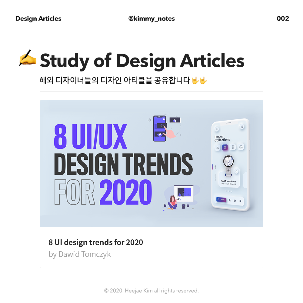 저는 저의 조사와 경험, 관찰을 토대로, 여러분들이 2020년에 알아야 하는 8가지의 UI/UX 디자인 트렌드를 매우 신중하게 선택했습니다.