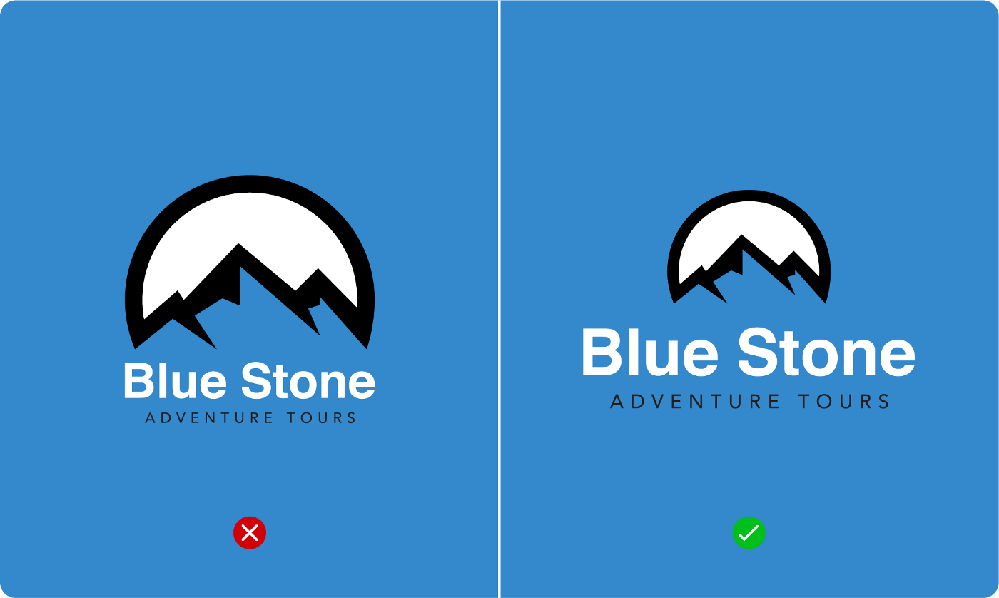 로고의 균형이 맞지 않으면, 당신의 회사는 약하게 보이고 잘못된 인상을 남길 수 있습니다. 불균형이 생기면 전체적으로 디자인에 집중하는 것이 어려워지고 메시지 전달이 더욱 어려워집니다. 균형의 문제는 하나의 요소가 시각적으로 크게 두드러져 불균형을 만들 때 발생합니다. 아래의 예에서 왼쪽의 로고는 심벌이 다른 두 요소보다 시각적인 비중이 더 커서 상단이 무겁게 느껴지므로 불균형하게 느껴집니다. 오른쪽의 로고는 각 요소가 비슷한 시각적인 무게를 가지고 있기 때문에 균형 잡힌 모습입니다.