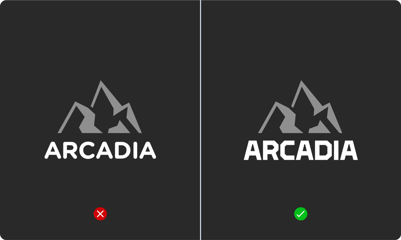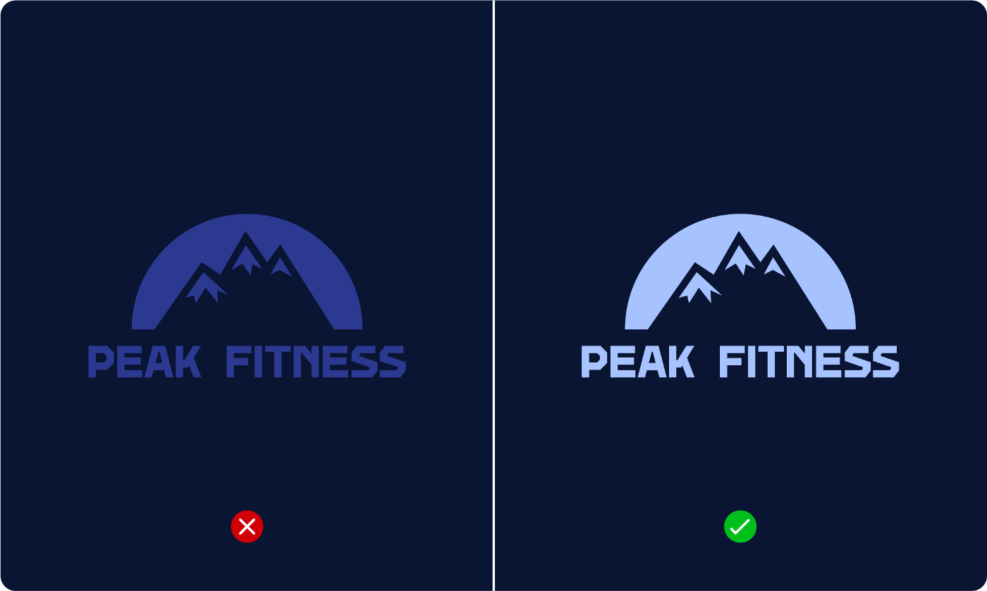 로고가 전경과 배경 요소 사이에 높은 대비를 가지지 못할 경우, 로고는 더 이해하기 어렵고 덜 전문적으로 보입니다. 아래의 예에서 왼쪽의 로고는 전경과 배경의 대비가 낮습니다. 이 컬러 조합은 로고를 더 이해하기 어렵게 만들고 전문적으로 보이지 않게 만듭니다. 오른쪽의 로고는 전경과 배경의 대비가 훨씬 높아서 이해하기에 더 쉬우며 더 전문적으로 보입니다.