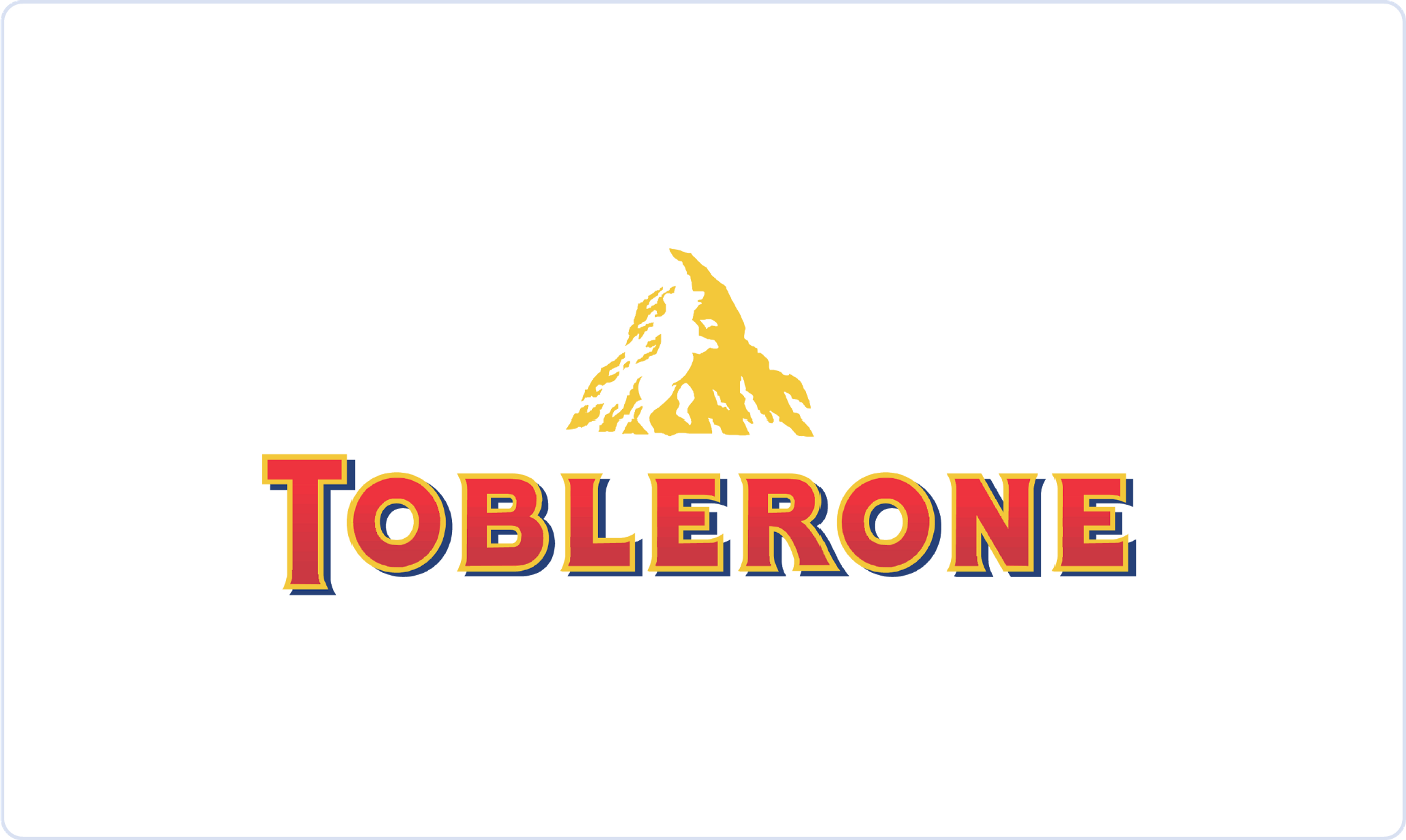 스위스 알프스에서 영감을 받은 토블론(Toblerone) 로고는 클래식한 초콜릿 바의 삼각형 모양을 반영합니다. 자세히 보면 심벌의 빈 공간을 통해 산에 숨어있는 곰을 볼 수 있을 것입니다. 이 곰은 토블론이 만들어진 베른(Bern)의 상징입니다.
