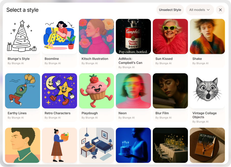 Generate style-consistent graphics instantly with Blunge. Train a private AI model on your brand or use public models with 10x better style adherence than any other AI platform.