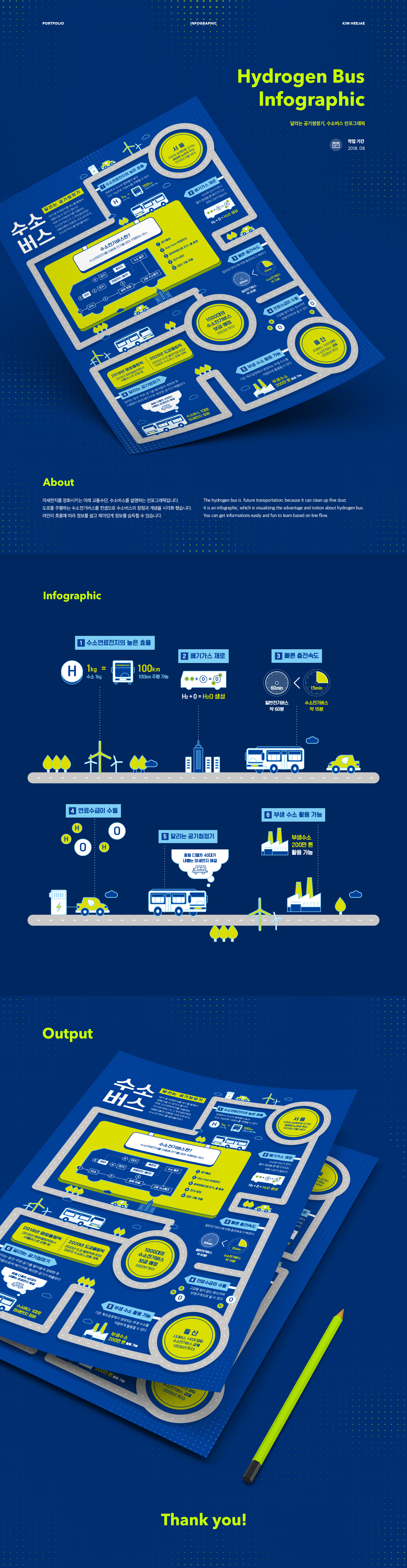 The hydrogen bus is future transportation. because It can clean up fine dust. It is an infographic, which is visualizing the advantage and notion about hydrogen bus. This infographic means hydrogen electric bus driving on the road and I designed it that you can read easily.